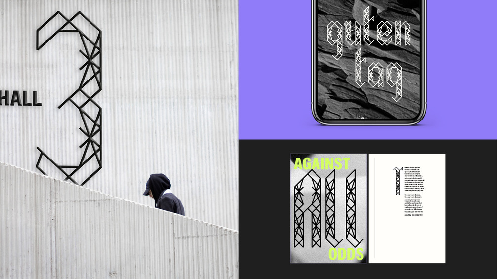 This typeface is sharp, brutalist and eccentric. It has been designed for display use and large format environmental graphics.